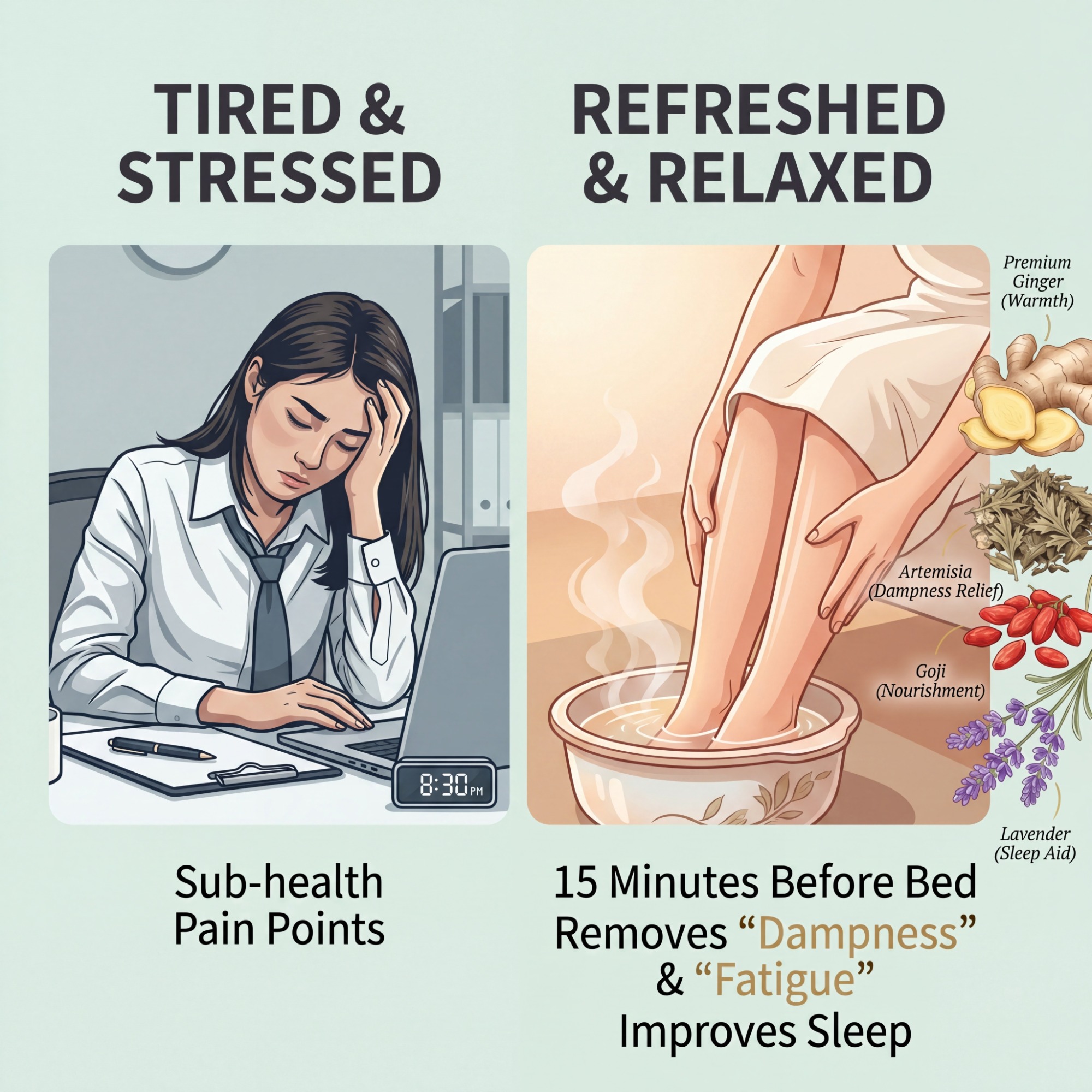 In a loud world, deep sleep is a luxury. As the warm scent of mugwort rises, it gently soothes your frazzled nerves through acupoint stimulation. This isn't just a soak; it's a 20-minute "Do Not Disturb" mode for your brain, allowing deep rest to happen naturally.
